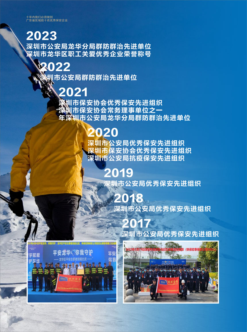 通過多年的深耕細(xì)作,公司秉承著“外樹形象,注重創(chuàng)新,成為行業(yè)知名品牌”的發(fā)展戰(zhàn)略,立足深圳,走出深圳,邁向珠三角,現(xiàn)已發(fā)展成為綜合、多元,跨區(qū)域經(jīng)營(yíng)、人物技防于一體化的保安服務(wù)企業(yè)。目前,公司已順利通過ISO國(guó)際質(zhì)量管理體系認(rèn)證、信息安全管理體系認(rèn)證。